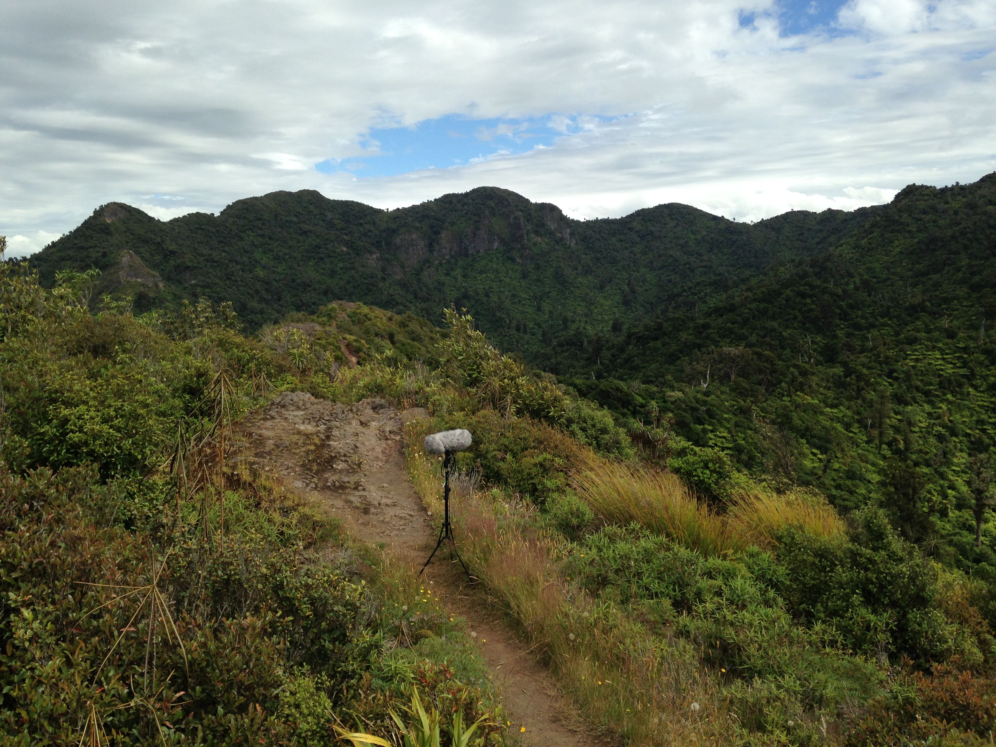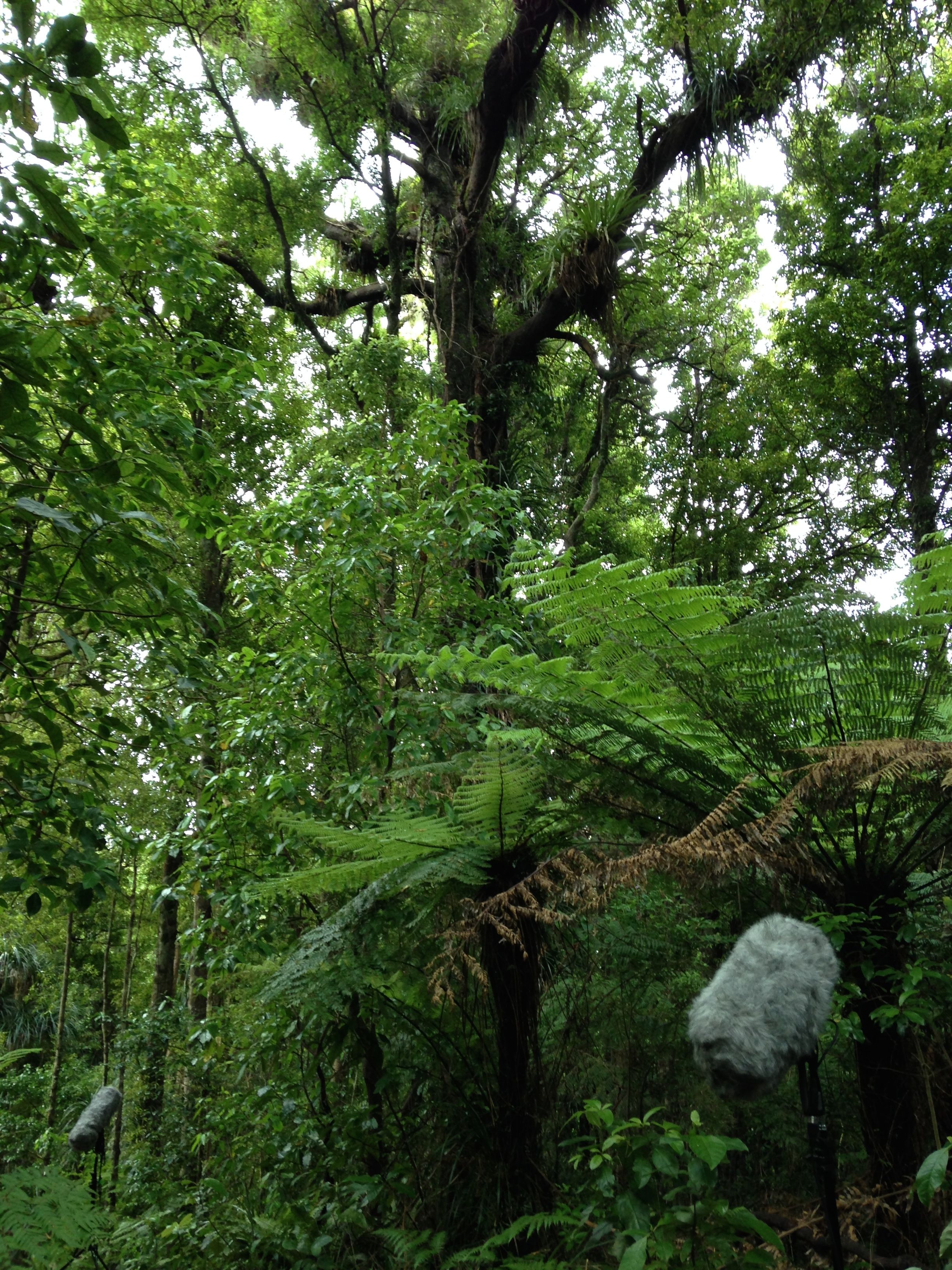 Bellies full and happy, we set off with our gear up mount Pirongia. This is where the mission gets serious. Previously we had been driving to locations and setting up our rig out of the back of the 4WD, (making sure it’s engine wasn’t ticking, of course). But now, we had our mics, stands and recorders in our backpacks as we hiked up some serious vertical tracks. OK, maybe not vertical or even actually that steep, but it was still a mission with heavy gear strapped to our backs, especially since we are generally a little unfit and had drunk a fair few wines the night before.